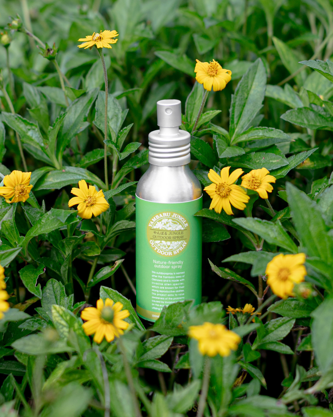 奇跡の森やんばるの生態系を脅かす外来植物の脅威を広く周知する事を目的に、緊急対策外来種である「アメリカハマグルマ」を抽出したエキスを配合したアウトドアスプレー。
